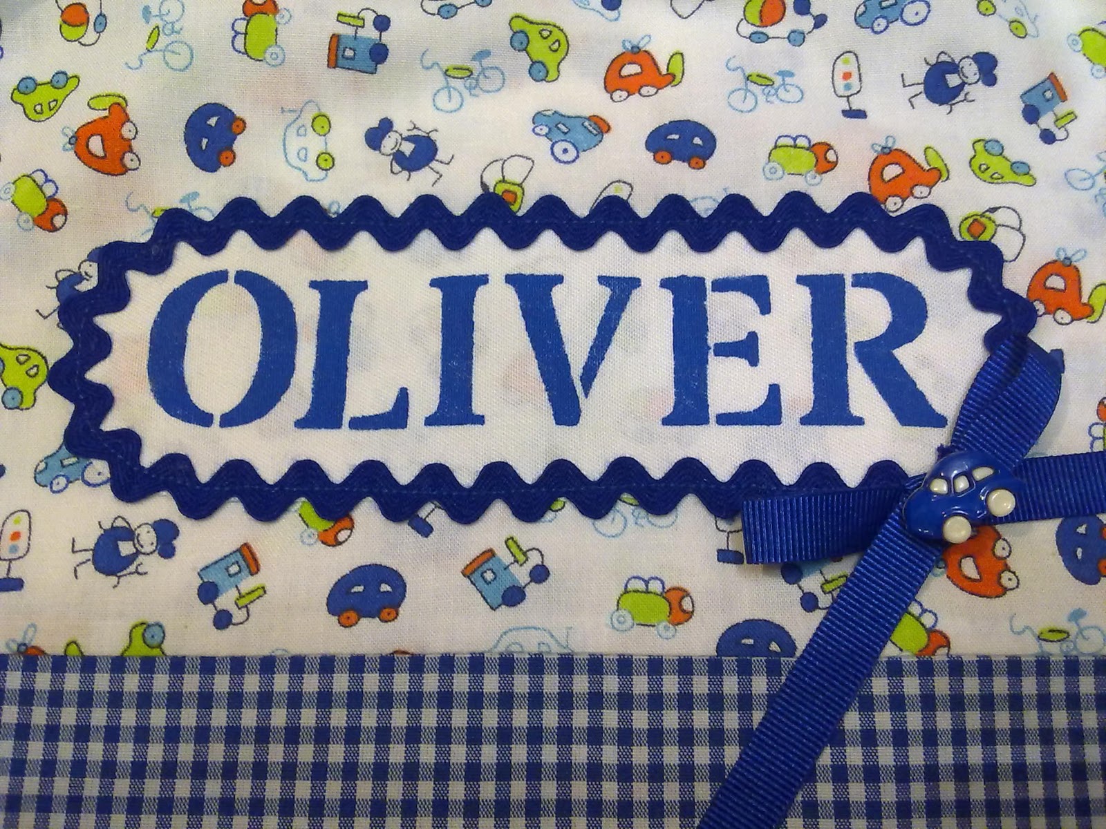 Esta bolsa de merienda con el babero a juego, la hice para un bebé que se llama Oliver, cumplió ahora un añito. Así ya la puede llevar a la guardería.